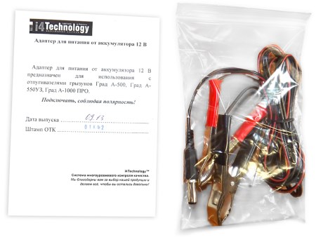• Когда возникает необходимость включить отпугиватель на максимальную мощность в автономном режиме. Конструкция отпугивателей "ГРАД" позволяет эксплуатировать их как от сети 220 В, так и в автономном режиме от батареек. Однако в режиме, когда излучатель отпугивателя работает на полную мощность и потребляет значительный ток, потребуется регулярная замена элементов питания. К тому же, при низких температурах КПД обычных батареек существенно снижается, что влечет за собой их частую замену. Для долговременной автономной работы отпугивателя "ГРАД" в подобных условиях специалисты ww.gad-get.ru рекомендуют использовать автомобильный аккумулятор, подключив его через данный адаптер.