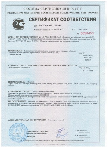Оборудование сертифицировано на территории РФ.